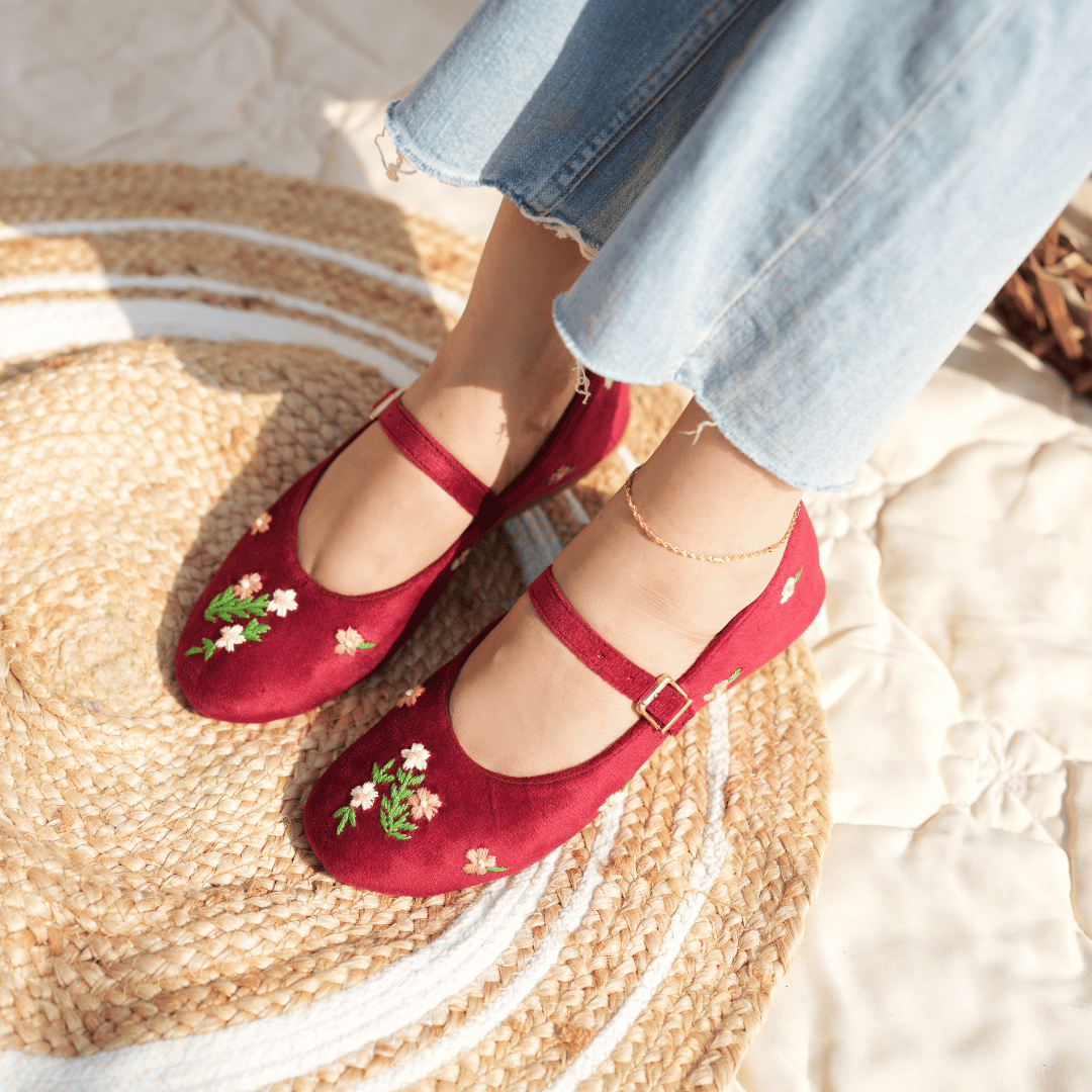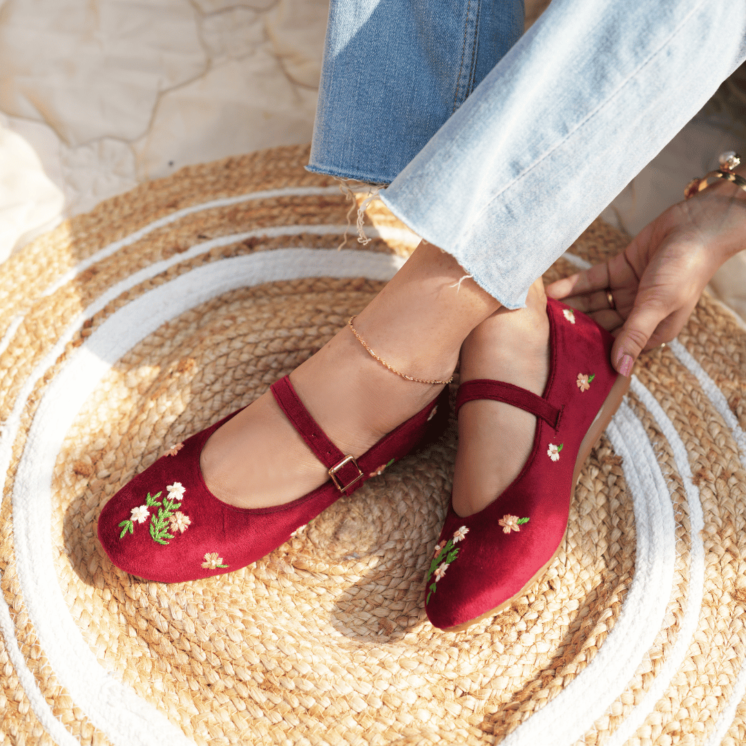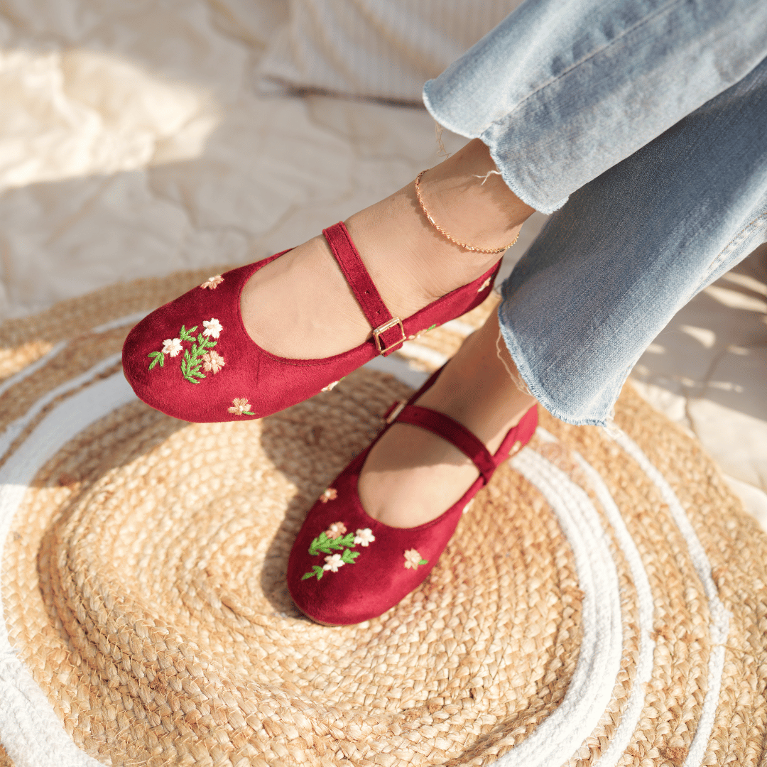 A delicate ballet pumps have intricate floral hand embroidery, made on maroon couture velvet. these pumps feature a slim strap and soft structure. Designed for broad feet.